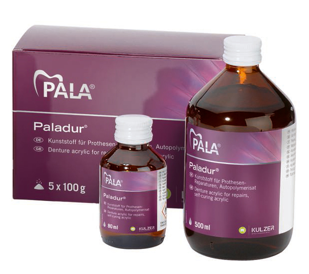 Resina a freddo per ribasature – ricambio Liquido monomero 500 ml. 64707938 KulzerResina autopolimerizzante a freddo, a rapido indurimento per un restauro efficace e sicuro delle protesi. Grazie alle sue eccezionali proprietà fisiche, Paladur è la resina per protesi adatta per il restauro di una protesi in Paladon 65 o Palapress, in seguito a frattura o scheggiatura. La facile lavorazione e la consistenza fluida, in gocce, consentono un restauro semplice e veloce. L'indurimento in strati più sottili può avvenire anche all'aria aperta, senza ricorrere alla polimerizzazione. La contrazione minima che caratterizza questa resina permette l'adattabilità della protesi anche dopo la riparazione.