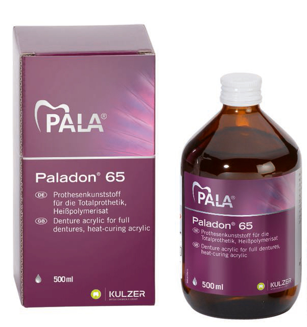 Resina a caldo – ricambio Liquido 500 ml. 64707674 KulzerPaladon 65 è la storica resina per palati polimerizzabile a caldo di Kulzer. Le sue proprietà equilibrate consentono una lavorazione molto razionale e garantiscono protesi di valore in termini di rapporto qualità–prezzo. La piacevole consistenza plastica consente un'eccezionale compressione del preparato. Per questo motivo, grazie al tempo di lavorazione molto lungo (fino a 60 minuti) si ha la possibilità di realizzare contemporaneamente più protesi. Paladon 65 può anche essere iniettato con Palajet.