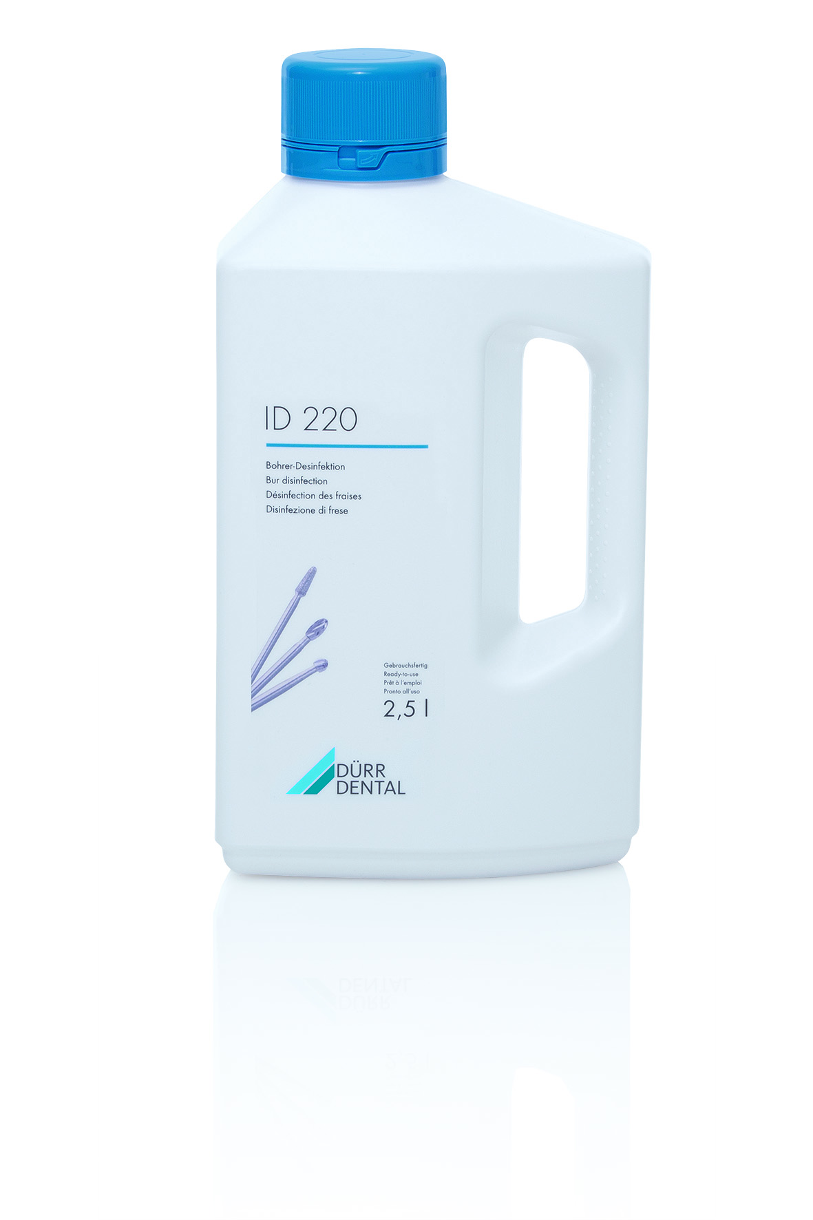 Soluzione per la pulizia e disinfezione a freddo degli strumenti rotanti – flacone da 2,5 lt. pronto all'uso DürrSoluzione alcalina pronta all'uso a base alcolica per la pulizia e la disinfezione degli strumenti rotanti. Battericida, fungicida, tubercolicida, virucida attivo su HIV e HBV. Contiene anticorrosivo. Utilizzabile anche in vasche ad ultrasuoni.