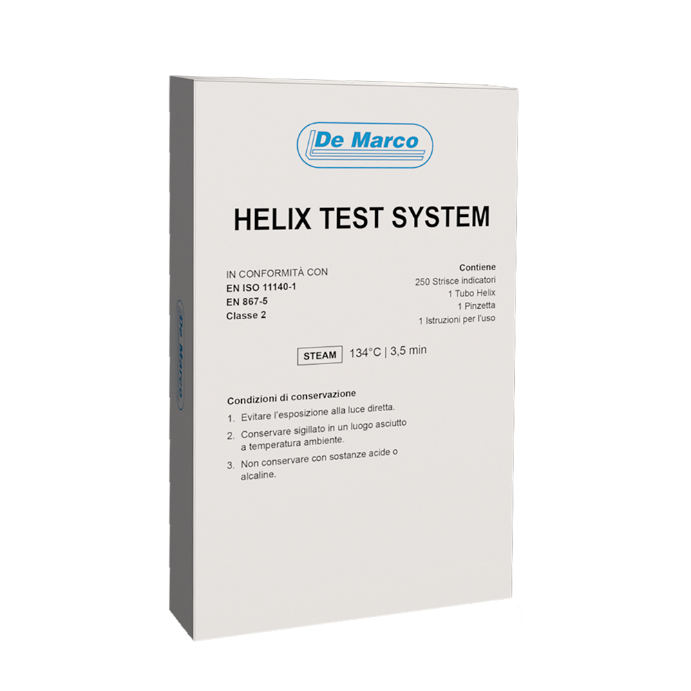 <b>Test professionale per la verifica della corretta penetrazione del vapore nei corpi cavi.</b> Cod. 17168 De Marco Helix Test De Marco è un <b>test professionale</b> per il controllo della <b>sterilizzazione</b> in autoclave, specificamente progettato per la verifica di un'<b>adeguata penetrazione del vapore.</b> Ideale per il monitoraggio dei processi di sterilizzazione in <b>corpi cavi,</b> come siringhe, cannule, turbine e tubi di dispositivi medici, strumenti chirurgici e attrezzature odontoiatriche. Grazie alla sua struttura a spirale, Helix Test De Marco <b>simula le condizioni più critiche del ciclo di sterilizzazione,</b> consentendo di individuare eventuali sacche d'aria o anomalie di funzionamento dell'autoclave nei cicli a 134° per 3,5 minuti e a 121° per 15 minuti. Il viraggio cromatico dell’indicatore chimico conferma la completa e la corretta diffusione del vapore, permettendo una <b>verifica affidabile e ripetibile del processo.</b> L’utilizzo regolare del test rappresenta uno <b>strumento essenziale per controlli di routine</b> e per l'individuazione tempestiva di eventuali anomalie del processo di sterilizzazione, garantendo la <b>sicurezza</b> del paziente e la <b>conformità</b> delle procedure previste. Non tossico e senza piombo, conforme alla norma EN ISO 11140-1. La confezione include 250 indicatori e un dispositivo a spirale.