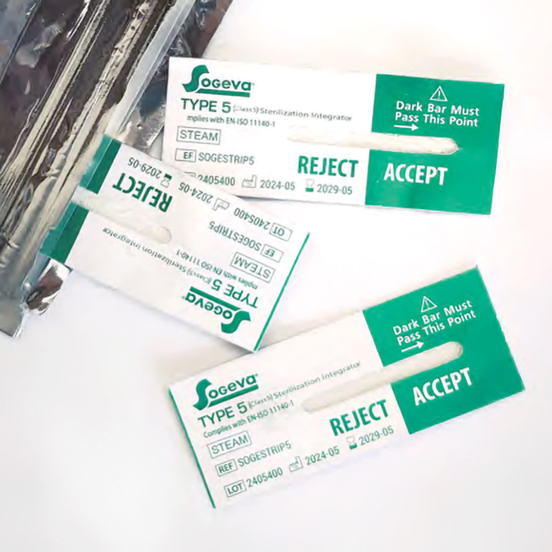 <b>Integratore chimico di classe 5</b> - Cod. SOGESTRIP5 - SOGEVA Può essere utilizzato ad ogni carico in autoclave per monitorare il tempo, la temperatura e le condizioni di esposizione al vapore e fornisce un controllo necessario alla sterilizzazione. L'integratore di classe 5 imita le funzioni dell'indicatore biologico in tre diversi punti durante il processo di sterilizzazione perchè monitora il tempo e la temperatura senza bisogno dell'incubatore a confronto dell'indicatore biologico. <b>Conforme alla norma UNI EN ISO 11140-1- (Classe 5).</b> Confezione: 250 striscette misura 20x50mm.