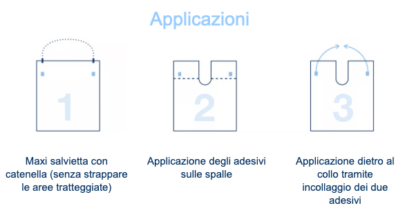 Mantelline <b>"made in Italy"</b> monouso proteggi paziente in pura ovatta di cellulosa altamente assorbente, accoppiata e goffrata con un film di polietilene impermeabile. Morbide e confortevoli, rispetto alle salviette tradizionali, offrono dimensioni maggiorate (50x61 cm), una comoda sagomatura su collo e spalle e pratici adesivi per il fissaggio. La mantellina può essere utilizzata in tre diversi modi: • come maxi salvietta tramite l’utilizzo di una catenella; • applicandola con gli adesivi direttamente sulle spalle del paziente; • come bavaglione incollando un adesivo sull’altro dietro al collo. <b>Assorbenti:</b> composte da carta altamente assorbente, accoppiata e goffrata con uno strato di polietilene, per impermeabilità e performance garantite. <b>Protettive:</b> grazie alla speciale sagomatura, coprono e proteggono interamente il paziente, spalle comprese, rimanendo aderenti e ben distese una volta assicurate al collo. <b>Pratiche:</b> il sistema dotato di adesivi consente di applicare la mantellina direttamente sulle spalle del paziente. L’uso della mantellina è facilitato dalle aree di strappo tratteggiate. Confezione: 150 mantelline colore azzurro