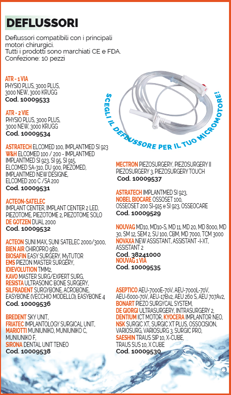 Deflussori compatibili con i principali motori chirurgici. Tutti i prodotti sono marchiati CE e FDA. Confezione: 10 pezzi Compatibile per: <b>MECTRON:</b> PIEZOSURGERY, PIEZOSURGERY II, PIEZOSURGERY 3, PIEZOSURGERY TOUCH