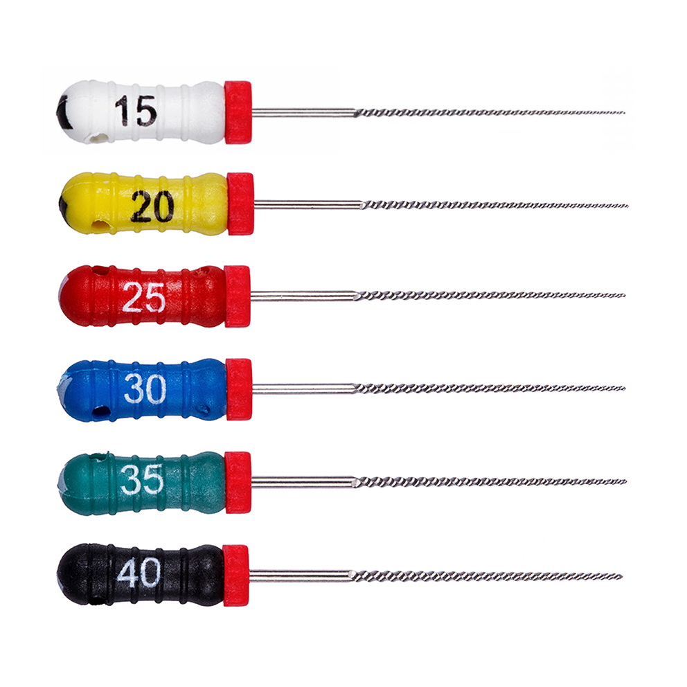 STRUMENTARIO CANALARE K-FILE CONICITÀ .02 In acciaio inox, manico in plastica con colorazione ISO. Blister sterile da 6 strumenti