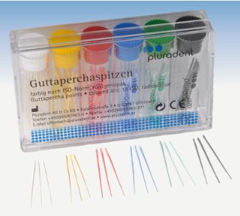 Punte di guttaperca da 28 mm, misura 15 codifica colore bianco – confezione da 120 coni divisi in 6 tubetti da 20 pezzi , Pluline PluradentGuttaperchaspitzen