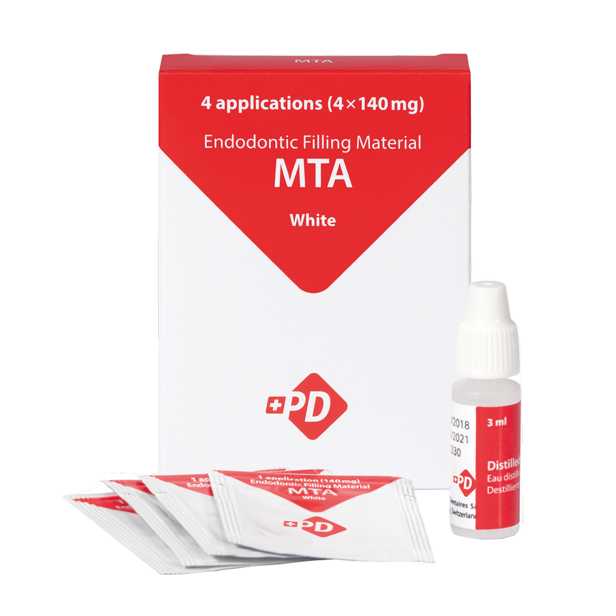 <b>Materiale Endodontico da riparazione biocompatibile</b> PD™ MTA White è un cemento di riparazione a base di aggregato di triossido minerale (mineral trioxide aggregate, MTA) formulato con tungstato di calcio e progettato per miscelarsi rapidamente e facilmente, raggiungendo senza sforzi la giusta consistenza per svariate procedure. Il carattere alcalino del cemento conferisce proprietà antibatteriche e il suo carattere idrofilico favorisce la neoformazione del cemento, creando un ambiente favorevole alla guarigione dei tessuti peri-dentali. Inoltre stimola la formazione di una barriera dentinale direttamente a contatto con la polpa. L’eccellente biocompatibilità di PD™ MTA White con la parete dentinale e la polpa ne consente l’uso per otturazioni radicolari ortograde e retrograde, per il trattamento dei riassorbimenti radicolari cervicali, come materiale di incappucciamento della polpa, nonché per l’apecificazione e la pulpotomia dei denti immaturi nei bambini e negli adolescenti. <b>Privo di ossido di bismuto per evitare macchie e scolorimenti.</b> Confezione (4 applicazioni): 4 bustine da 140 mg + flacone acqua distillata 3 ml.