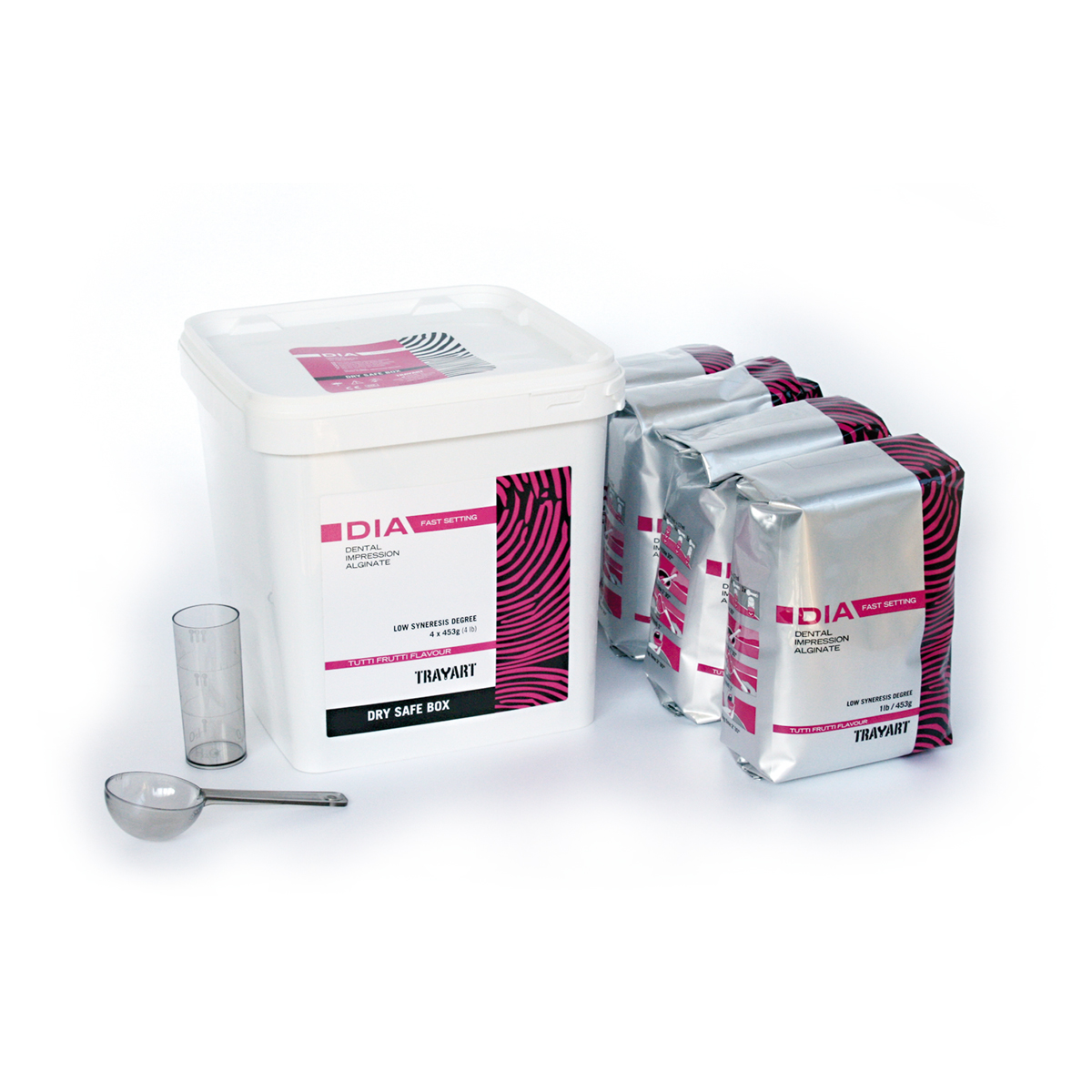 Dia Dental Impression Alginate fast set , alginato a presa rapida, confezione di 4 buste da 453 grammi + misurini + barattolo contenitore per conservazione alginato, codice 3S1002 TrayartAlginato dust free ad elevata stabilità dimensionale e tempo di presa rapido (Fast Setting). Aroma tutti frutti. Colore rosa. Confezione: 4 buste da 453g. ; misurini; barattolo conservazione alginato Dry Safe Box