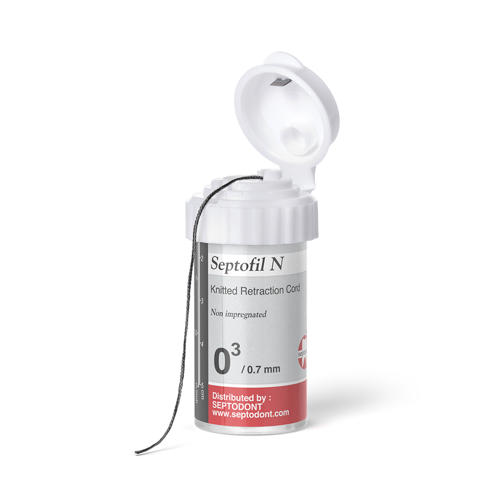 Filo retrattore non impregnato. Fili non impregnati, in cotone 100% intrecciato, di forma cilindrica, che permettono un agevole posizionamento nel solco gengivale. Septofil N è disponibile in 6 diametri identificabili da diversi colori.