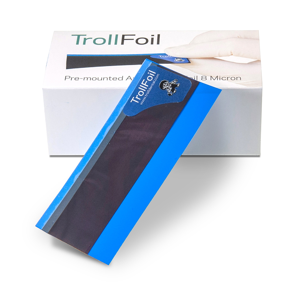 Carta articolazione con supporto, colore blu, 2 lati, 8 µ – confezione da 100 pz. 12000501 TrollDentalCarta d'articolazione ad alta precisione, marca su entrambe i lati, montata su un supporto plastico che evita l'uso delle pinzette. Di spessore 8 micron. Trollfoil è utilizzabile in campo sia asciutto che bagnato, su superfici metalliche e ceramica (FR9)