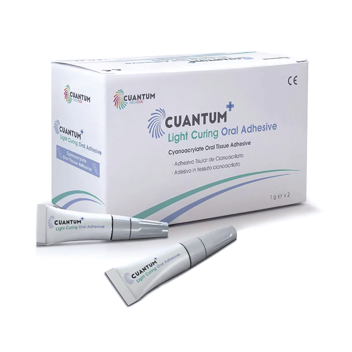 Adesivo liquido tissutale a base di cianoacrilato, indicato per l'adesione di ferite orali e suture, favorendone la chiusura e la formazione di uno strato protettivo. Per una chiusura ottimale attendere 30-40 secondi. Di facile e veloce applicazione, è sufficiente una sola applicazione. Al contrario delle colle "auto polimerizzabili" CUANTUM LIGHT CURING resta in formato gelatinoso sino a polimerizzazione avvenuta con lampada. <b>Caratteristiche principali:</b> Cuantum light curing è una colla chirurgica avanzata con una formulazione a base di cianoacrilato di n-butile e tecnologia brevettata. <b>• Polimerizzazione controllata dalla luce: </b>attivabile esclusivamente con luce per risultati immediati, sicuri e precisi. <I>Questa caratteristica unica consente al professionista di gestire il processo di polimerizzazione secondo le necessità specifiche del trattamento.</I> <b>• Composizione antibatterica:</b> riduce il rischio di infezioni, isolando l’area chirurgica dai batteri. <b>• Proprietà emostatiche:</b> favorisce la coagulazione riducendo il sanguinamento. <b>• Adesione sicura e duratura:</b> si stacca naturalmente in pochi giorni, senza bisogno di rimozione. <b>• Facilità d’applicazione:</b> uno strato sottile è sufficiente per garantire una chiusura ottimale in soli 30-40 secondi. <b>Applicazioni cliniche:</b> Cuantum light curing è versatile e si presta a numerosi utilizzi: <b>Odontoiatria:</b> • Chiusura dell’incisione della mucosa orale sull’alveolo post-estrattivo. • Rivestimento di tessuti gengivali scoperti. • Dopo innesto osseo o gengivale. • Margine parodontale post-pulizia. • Trattamento di ulcerazioni orali superficiali. <b>Chirurgia Generale:</b> • Suture interne durante operazioni di ernia inguinale, sostituendo le tradizionali suture. • Riempimento di collagene e ricostruzione ossea. • Proprietà emostatiche, antibatteriche. Non sterile. Confezione: 2 tubetti da 1 g. cad.
