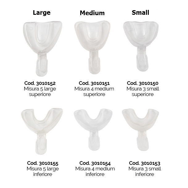 Liscio n.5 Large superiore trasparente. Realizzato in PVC atossico; disinfettabile a freddo; utilizzabile con qualsiasi materiale (per alginati usare l'adesivo); disponibile in tre misure superiori e tre inferiori.