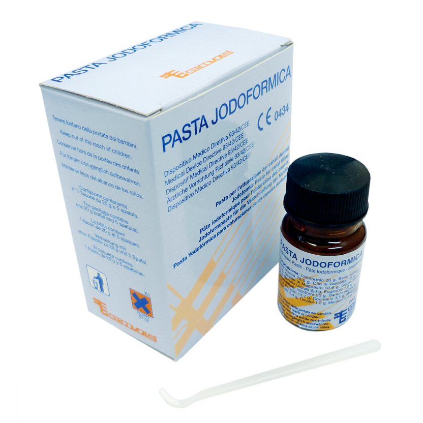 Pasta Iodoformica Antisettica, semiradiopaca per otturazioni canalari e nel trattamento di fistole e granulomi. Confezione: Flacone da 20 g con spatole applicatrici