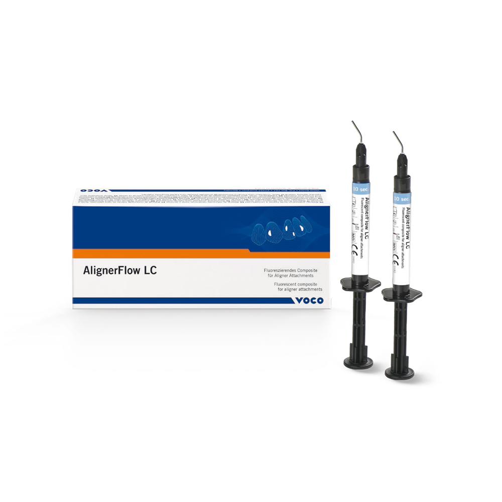 Composito fluorescente per la creazione di attacchi per allineatori, ritenzione di allineatori, fissaggio di retainer linguali e strutture occlusali. Fluorescente sotto la luce UVA, ottimizza il flusso di lavoro dell’attacco, dalla produzione alla rimozione; la fluiditą specifica di AlignerFlow LC permette di riempire con precisione il modello dell’allineatore, evitando sia deficit che eccedenze di materiale. Elevata stabilitą e resistenza all’abrasione, ottenuta grazie riempitivo dell’83% in peso. <b>Indicazioni:</b> • Creazione di attacchi per allineatori • Ritenzione di allineatori • Fissaggio di retainer linguali • Strutture occlusali Confezione: 2 siringhe da 2 g cad.+ 20 puntali