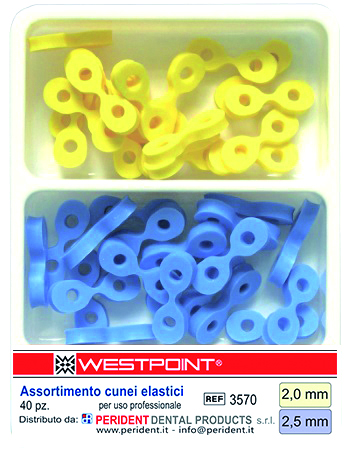 Kit assortito di cunei elastici in silicone , 20 gialli da 2 mm, 20 blu da 2,5 mm, codice 3570 WestpointCunei elastici in silicone. Utilizzabili come cunei di fissaggio con le matrici sezionali e come sostituto di fili o cordini per il fi ssaggio della diga dentale. Applicazione semplice con specifica pinza. Confezione: n. 20 cunei gialli – spessore 2 mm n. 20 cunei blu – spessore 2,5 mm