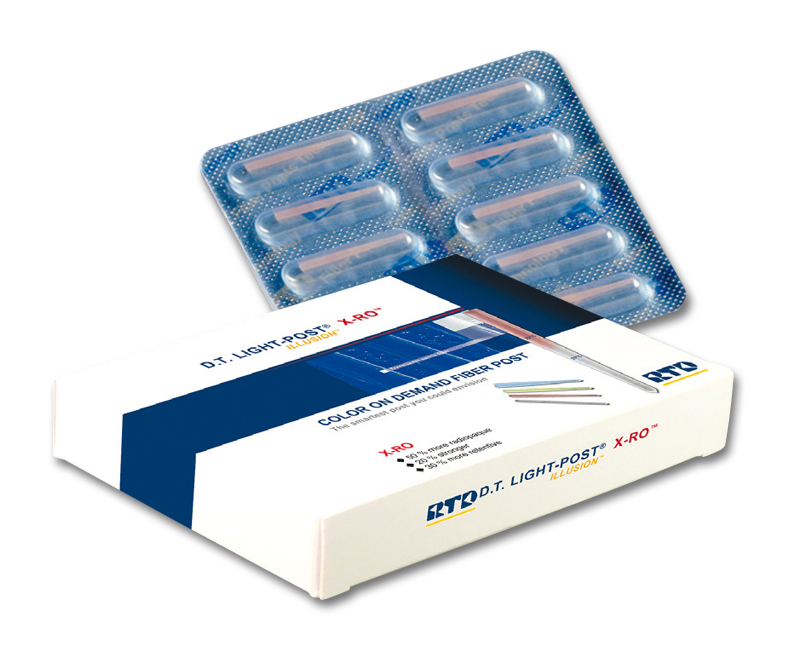 DT–LIGHT–POST ILLUSION n.3 Blu 10pz diam.1,20–2,20mm V861981000103 RTD DentsplyPerno in fibra di quarzo traslucente a doppia conicità con radiopacità (+50%) e resistenza (+20%) migliorate. Perno termo–mimetico che inserito in bocca diventa completamente traslucente ma in caso di necessità riacquista il suo colore originario con un getto d'aria fredda. I perni RTD si usano in abbinamento a Core X Flow, il composito duale per la cementazione dei perni in fibra e la ricostruzione dei monconi. Disponibili in 4 misure (0.5 , 1, 2 e 3), identificate dall'anello colorato.