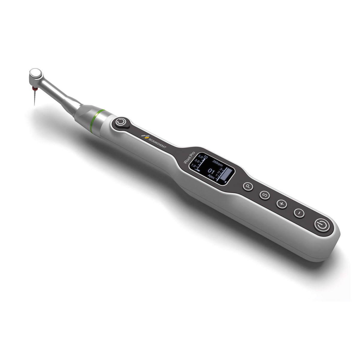 <b>MOTORE ENDODONTICO PORTATILE CON RILEVATORE APICALE INTEGRATO</b> iRoot Pro è il motore endodontico portatile con rilevatore apicale integrato con controllo a quattro velocità per misurare e preparare il canale radicolare. La sua connessione bluetooth permette la sincronizzazione con altri dispositivi per ottimizzare il processo di lavoro. <b>Caratteristiche principali:</b> • Possibilità di salvare in memoria <b>10 diverse impostazioni per il trattamento canalare.</b> • <b>Display OLED integrato</b> per poter visualizzare il localizzatore apicale integrato. • <b>"Testina multiposizione"</b> consente di ruotare facilmente e modificare la posizione del contrangolo con 6 diverse angolature. • Possibilità di impostare sia il <b>movimento continuo </b>che <b>reciprocante</b> (quest’ultimo in senso orario/antiorario). • È possibile scegliere tra 4 diverse modalità di lavoro: <b>solo motore endodontico, solo rilevatore apicale, motore e rilevatore apicale, motore e rilevatore apicale con funzionalità automatica.</b> • Connessione USB per caricabatterie e Bluetooth (collegamento con iRoot Apex e Wispex). • Controllo del torque e della velocità. • Compatibile con la maggior parte degli strumenti NiTi. • Diverse funzionalità disponibili: <b>"Auto Reverse", "Reverse" e "Auto Reciprocating"</b> quando raggiunge il limite di torque. Per esempio, la funzione"Auto Reverse" viene attivata in base a una comparazione tra carico e parametro di torque impostato. • Con sensore automatico: il motore inizia a lavorare quando entra in contatto con la dentina e si ferma automaticamente quando si allontana. • Batteria ricaricabile in ca. 180 minuti attraverso la base di ricarica. • Contrangolo 16:1 autoclavabile ad alta temperatura. • Pedale opzionale collegabile con Bluetooth. <b>Specifiche Tecniche</b> Velocità: 150-800rpm Torque: 0.6-4.0Ncm Peso: 780 gr Batteria: 750mAh/3.7VDC 100-240VAC - ricaricabile e sostituibile Misure: 208 x 25 x 26 mm (l'unità centrale include il contrangolo) Dimensioni del caricabatterie: 123 x 61 x 81mm <B>Confezione:</b> • 1 Micromotore con rilevatore apicale • 1 Contrangolo • 3 Impugnature contrangolo • 1 Ugello a spruzzo • 1 Cavo di misurazione A • 1 Cavo di misurazione B • 3 Clips labiali • 1 Morsetto di connessione • 1 Adattatore alimentazione • 1 Cavo USB • 1 Base di ricarica • Manuale di istruzioni