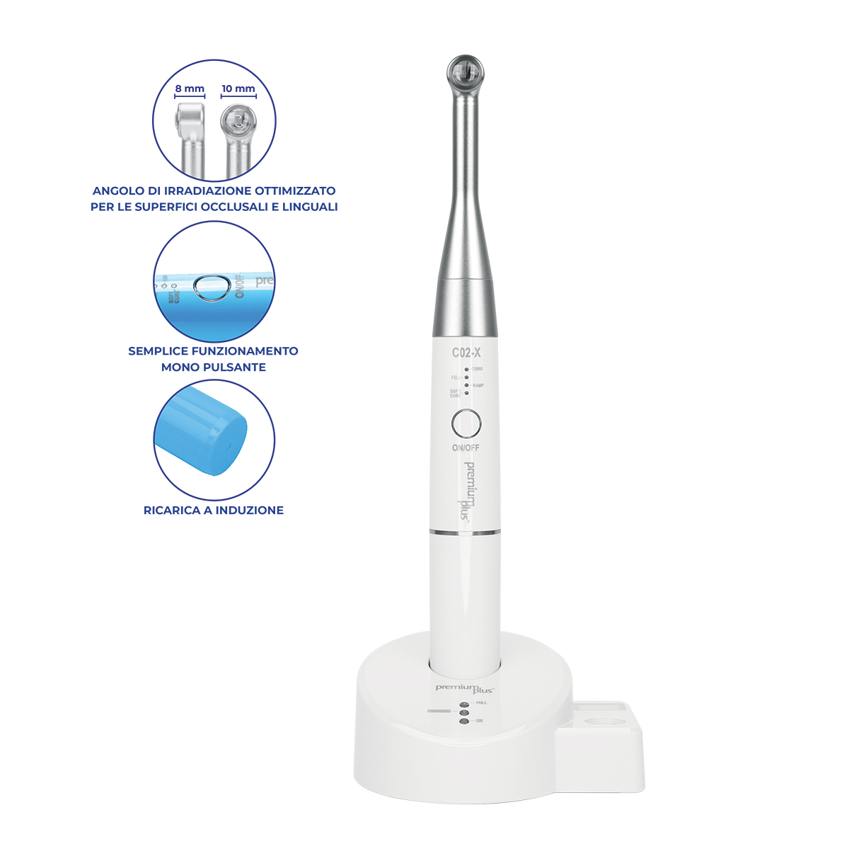 <b>MODEL-X CURING LIGHT - LAMPADA POLIMERIZZANTE CON GUIDA LUMINOSA DIRETTA.</b> PPC02XWT Premium Plus <b>• 4 modalitá di polimerizzazione:</b> turbo, full, ramp & soft cure. <b>• doppia lunghezza d’onda:</b> 390 ~ 480 nm polimerizza tutti i tipi di compositi. <b>• guida luminosa rotante a 360°:</b> per un accesso ottimale in tutte le aree. <b>• tempi di polimerizzazione preimpostati:</b> funzionamento rapido, efficiente e intuitivo. <b>• design pulito e igienico:</b> facile da pulire e riduce il rischio di contaminazione. <b>• base di ricarica intelligente:</b> ricarica a induzione con misuratore di luce integrato. <b>• garanzia 24 mesi:</b> per la vostra tranquillitá. <b>• peso:</b> 139 gr. <b>• dimensioni:</b> Ø 27 mm x L 255 mm. sostituisce 41285000